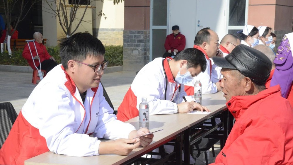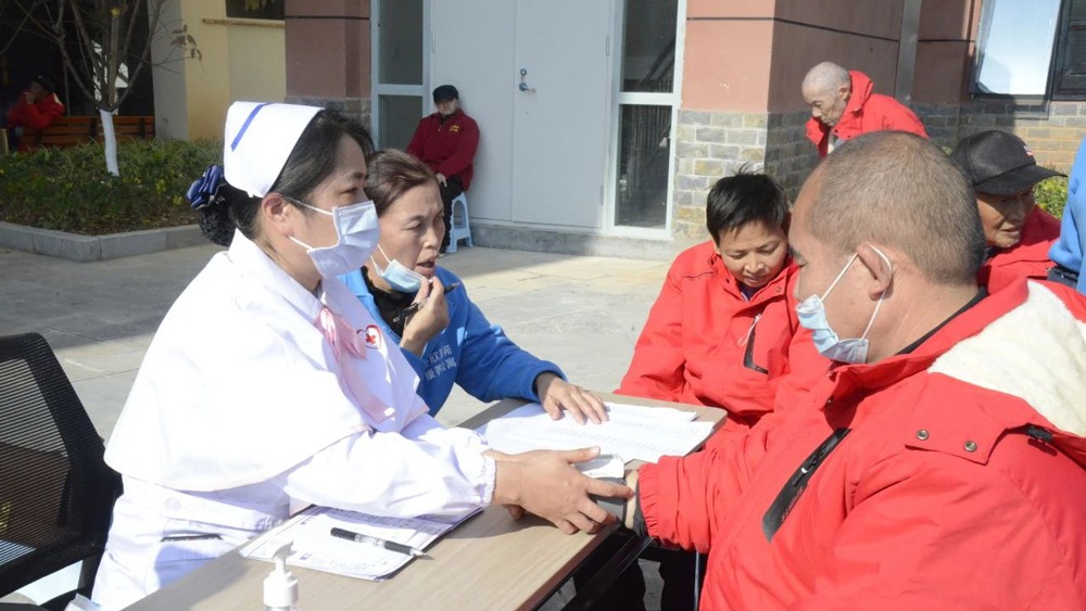 义诊现场,医务人员详细了解每位老人的生活及身体状况,并为老人们测血压、测血糖。