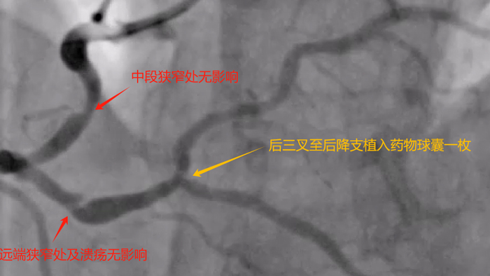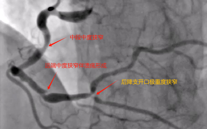 造影可见:左冠双开口,前降支近端及回旋支近端均重度狭窄;右冠极度扭曲,中段中度狭窄,远端中度狭窄伴溃疡形成,后三叉处及后降支极重度狭窄。造影结果比我预想的结果要差,多支血管病变,而且右冠病变很复杂。