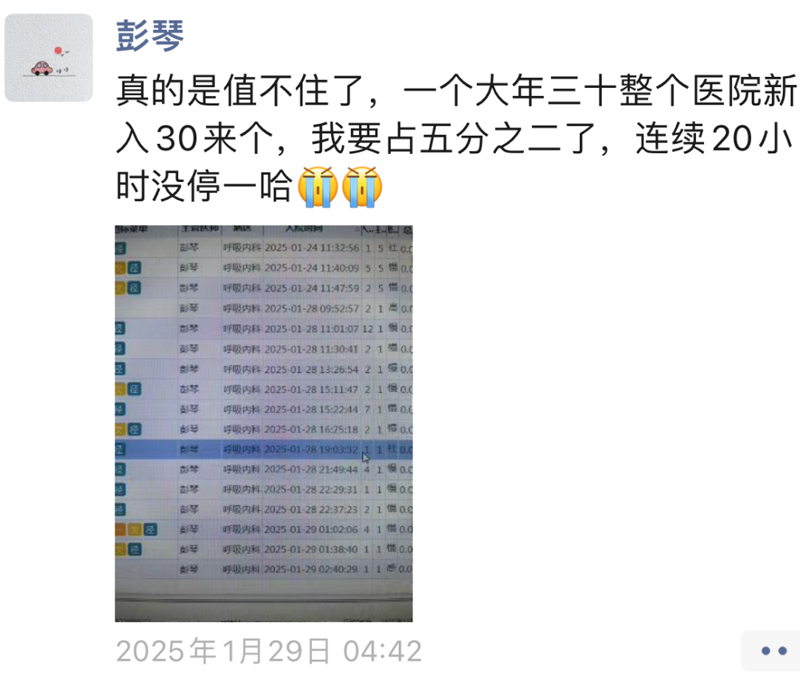在呼吸与危重症医学科,医生彭琴与11个新入院病人及28个未出院患者共同守岁,初一凌晨四点四十二分,彭医生放下手中的听诊器,伸了新年第一个懒腰。