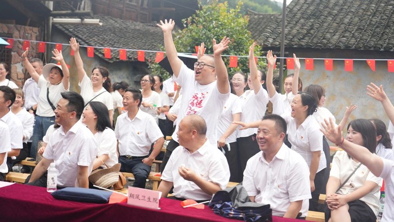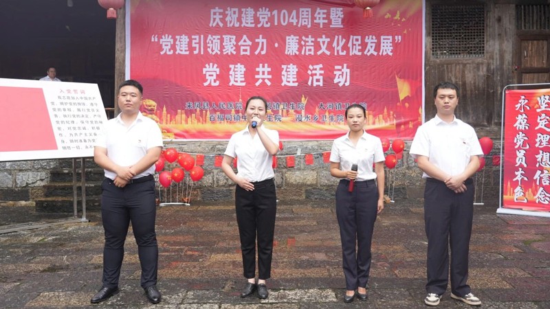 在中国共产党成立104周年之际,为深入学习贯彻党的二十大精神,持续深化中央八项规定精神入脑入心,激励党员干部守纪律、强作风、勇担当,7月1日,来凤县人民医院联合翔凤镇卫生院、大河镇卫生院、漫水乡民族卫生院、百福司镇中心卫生院等4家紧密型医共体单位,在张富清红色教育基地——大河镇独石塘村张家院子举办“党建引领聚合力 廉洁文化促发展”主题庆祝活动。来自各单位的党员干部通过精心编排的文艺节目,生动演绎了新时代医疗工作者的廉洁担当。