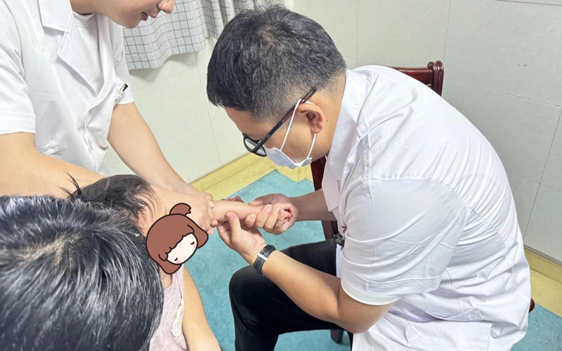患儿刘某之女今年4岁,因在幼儿园不慎摔伤导致左前臂肿痛难忍急来院就诊,门诊医师行检查显示左前臂尺桡骨双骨折并有骨弯曲,穆中杰教授与科室正骨医师团队立即准备好手法复位所需的杉树皮夹板固定材料,助手固定牵拉患儿左前臂,穆教授在患儿变形的手臂上一压、一按、一推、一挤,再用手在骨折处一捋,随后对紧张的小朋友说:“接好了,你看一点都不疼吧”。随后正骨团队立即使用杉树皮夹板固定好患肢。