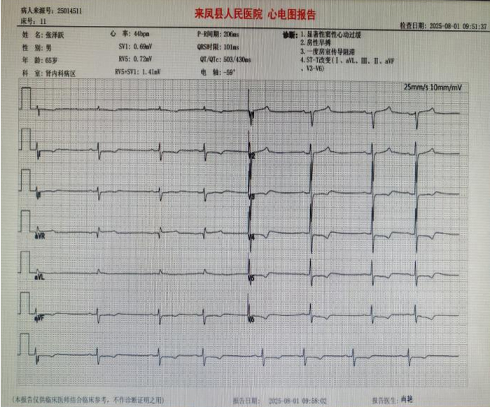 2025年8月1日,大河卫生院一位规律透析患者张某某突发内瘘血管失功,饮食不当导致代谢废物与钾离子在体内急剧蓄积,大河卫生院血透室杨医生果断判断,急查电解质,血钾浓度飚升至8.21mmol/L的致命水平(远超正常值3.5-5.5mmol/L)!心脏在致命高钾血症重压下濒临停摆,心率仅每分钟二十余次,生命悬于一线。