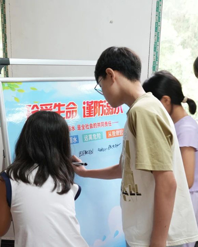 夏日炎炎,预防中暑活动现场,还组织了防溺水知识有奖问答,儿童及家长们踊跃抢答,现场气氛热烈,有效巩固了所学知识。活动还特别设置了“安全承诺签名墙”环节,家长和孩子们纷纷签下自己的姓名,许下珍爱生命、预防溺水的郑重承诺。