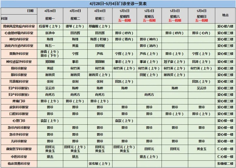 来凤县人民医院每周门急诊坐诊信息(4月28日-5月4日)