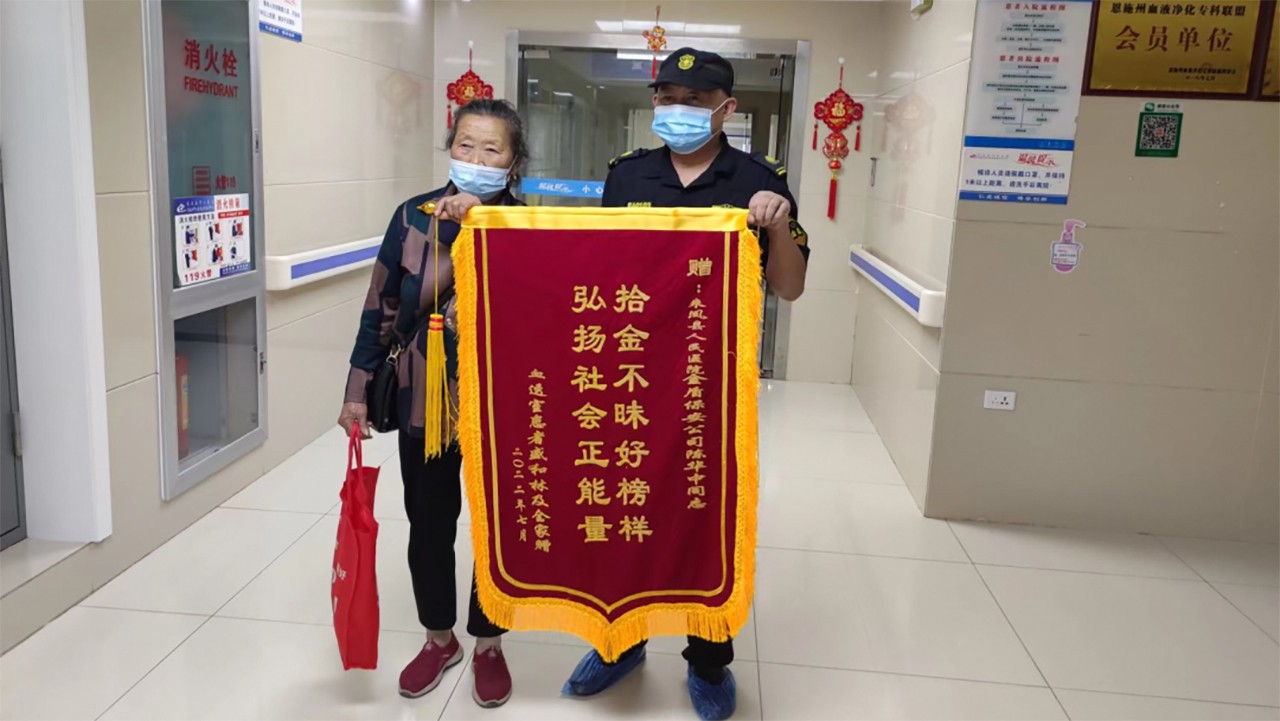 7月13日,来凤县人民医院血透室患者盛和林及其家属不慎将随身携带的8800元现金遗失在我院仁心楼收费处附近,随后被为父亲住院缴费的向志英女士拾得,并交给了我院安保人员陈华中。陈华中在拿到遗失现金后及时联系保卫科工作人员黄星华并交予其保管。